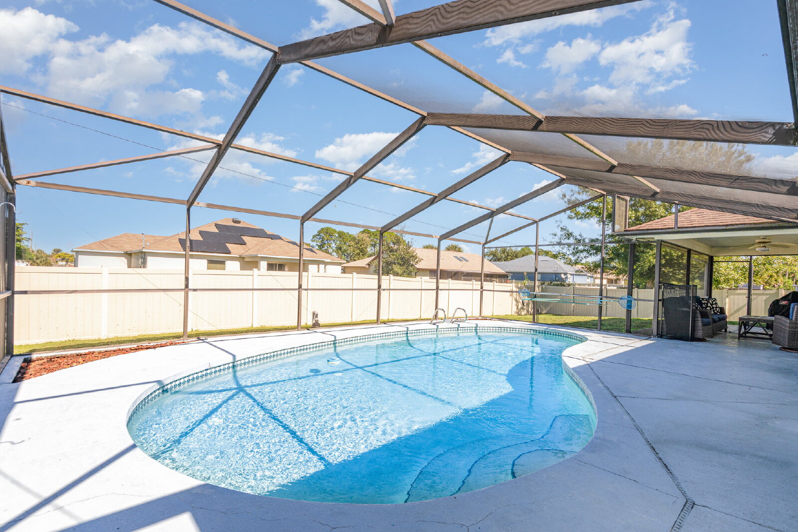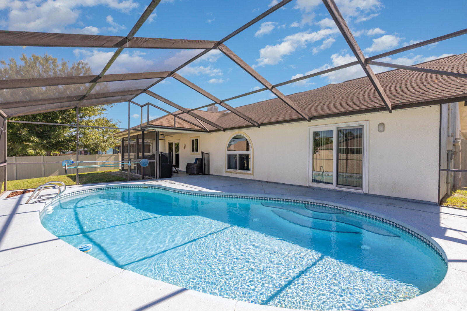 Welcome to this beautifully updated 3-bedroom/2-bath split-floorplan home, offering comfort, style, and Florida living at its finest. Step inside to find an open layout featuring quartz island with breakfast bar, and sleek finishes throughout. The home boasts tile flooring in every room, providing a clean, cohesive feel and easy maintenance. Enjoy peace of mind with impact windows and the convenience of no HOA restrictions. The spacious primary suite is privately situated apart from the guest bedrooms, offering an ideal split-bedroom plan. Outdoor living is a true highlight-relax or entertain in your screened-in pool area, complete with a covered lanai, perfect for enjoying year-around sunshine and gatherings. This home combines modern upgrades, excellent layout, and resort-style outdoor living-the perfect rental opportunity in a desirable location. Make your appointment today to view!